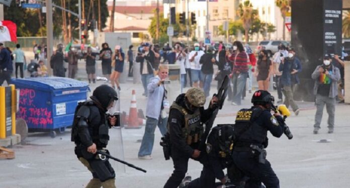 واشتبك أفراد أمن أمس السبت مع المحتجين في مواجهات متوترة في منطقة باراماونت في جنوب شرقي لوس أنجلوس، حيث شوهد أحد المحتجين يلوح بالعلم المكسيكي وغطى بعضهم أفواههم بأقنعة تنفس.