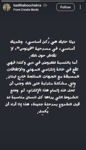 وأضاف: “اما بالنسبة للعروض في دبي وكندا فهي تقع في خانة التزامي المهني والاتفاقات المسبقة مع الجهات المنتجة خارج لبنان، واي مشكلة مترتبة على ذلك وجب أن تحل عند إتمام هذا الإلتزام، ثم وضع الشروط التي يراها كل انسان مناسبة له قبل الشروع بمرحلة جديدة، هذا اذا اراد أن يُكمل”.