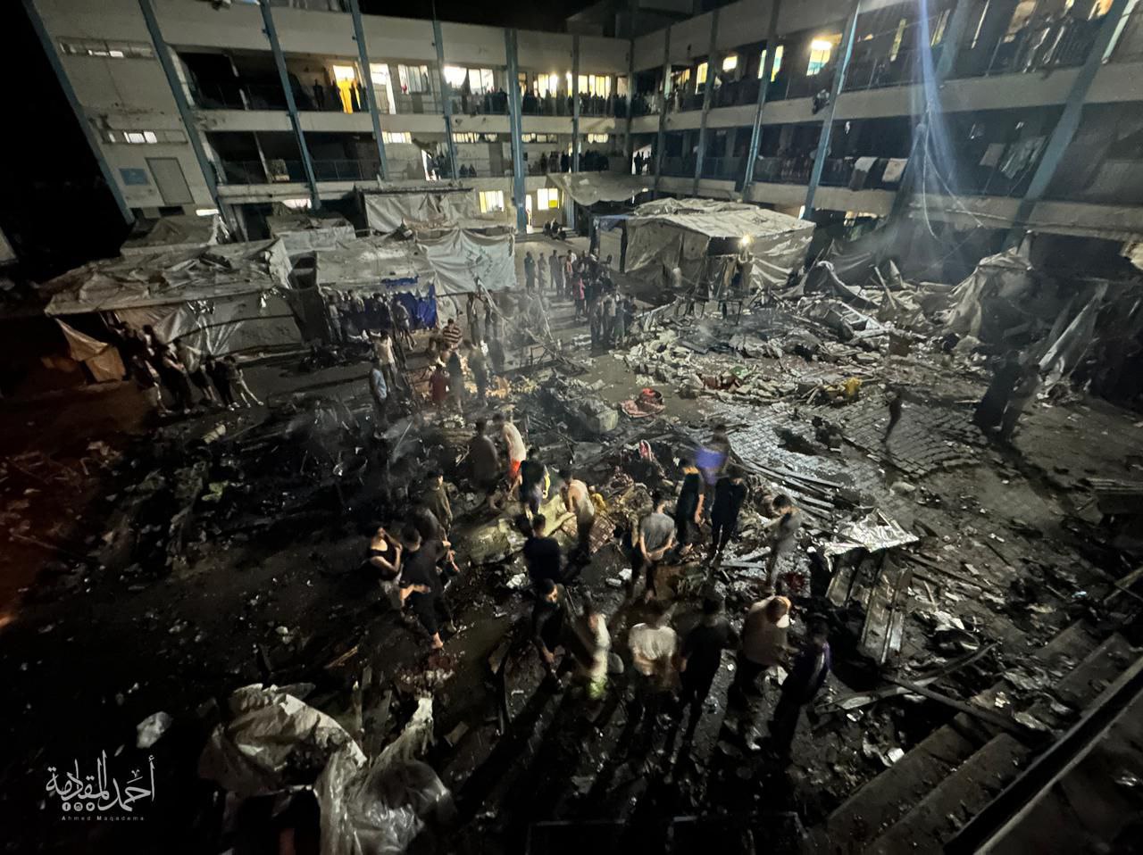 اندلع حريق بعد قصف الاحتلال مدرسة أبو حلو الشرقية التي تؤوي نازحين في مخيم البريج وسط قطاع غزة، حيث أدى القصف الى سقوط شهداء وإصابات.