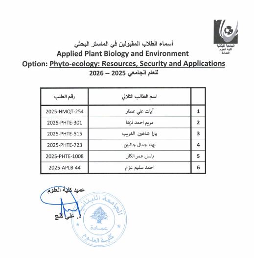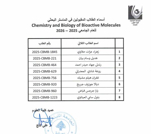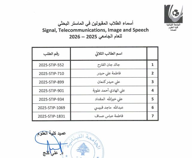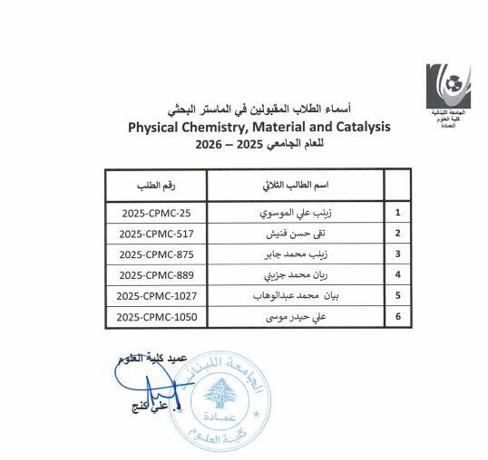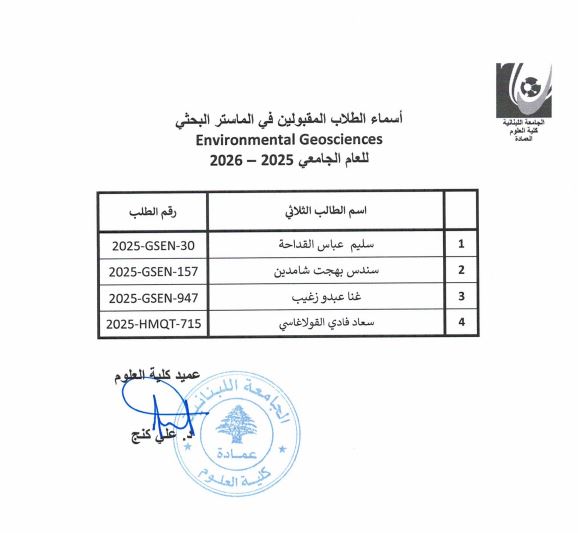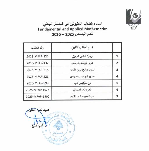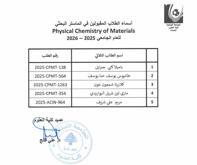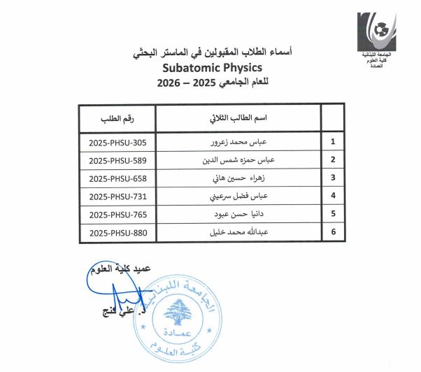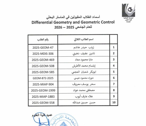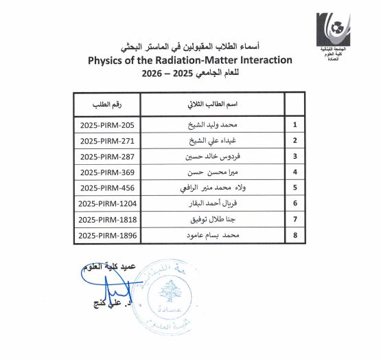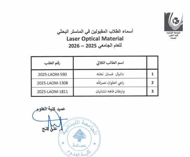 الرئيسيةمنوعاتشبابالمقبولون في اختصاصات السنة الثانية/ماستر بحثي في كلية العلومشبابشريط الاحداثالمقبولون في اختصاصات السنة الثانية/ماستر بحثي في كلية العلوم نشرت الجامعة اللبنانية أسماء الطلاب المقبولين في اختصاصات السنة الثانية/ماستر بحثي في كلية العلوم للعام الجامعي 2025 – 2026النتائج مرفقة بالصور التالية: Tagsاختصاصاتالجامعة اللبنانيةكلية العلومماستر بحثيمقبولونشريط الأحداثتدابير سير السبت 05/12/2025 607 قتيلاً بإعصار سريلانكا (فيديو) 05/12/2025 رجّي لمجلس الأمن: الدبلوماسية خيارنا 05/12/2025 80 قتيلاً في السودان.. والأمم المتحدة تحذر من كارثة إنسانية 05/12/2025 مقالات ذات صلة أمن و قضاءتدابير سير السبت 05/12/2025 شريط الاحداث607 قتيلاً بإعصار سريلانكا (فيديو) 05/12/2025 سياسةرجّي لمجلس الأمن: الدبلوماسية خيارنا 05/12/2025