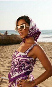 النجمة بلقيس فتحي كانت من أولى من أعاد إحياء هذه الموضة، حيث اختارت وشاحًا حريريًا نابضًا بالألوان من دار Dolce & Gabbana، ولفّته بإحكام حول رأسها مع عقدة أنيقة عند العنق. الإطلالة عكست مزيجًا بين البهجة والترف، ومنحتها هالة سينمائية لافتة.