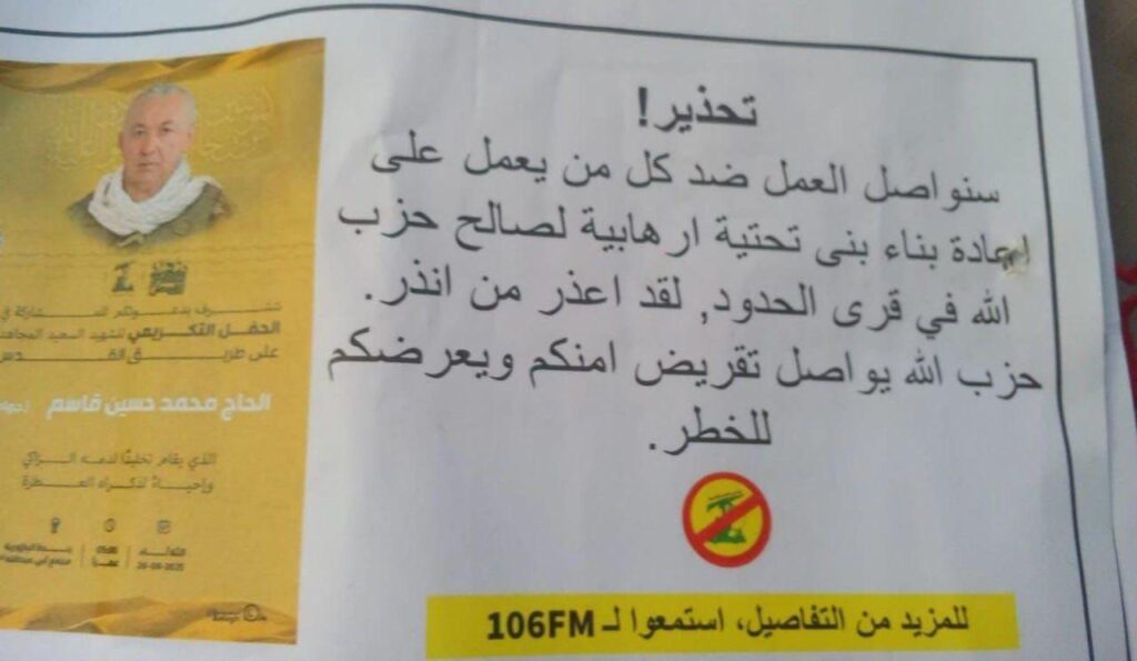 الرئيسيةأمن و قضاءمنشورات تحريضية في بلدة عيتا الشعب (صورة)أمن و قضاءشريط الاحداثمنشورات تحريضية في بلدة عيتا الشعب (صورة) القى جيش الاحتلال الإسرائيلي منشورات تحريضية في بلدة عيتا الشعب جنوب لبنان.وتزامن مع المنشورات التحريضية غارات عنيفة على منطقة علي الطاهر في النبطية الفوقا على دفعتين. Tagsجنوب لبنانعيتا الشعبمنشورات تحريضيةشريط الأحداثوصول موكب رئيس الحكومة إلى مدينة صور 07/02/2026 نتنياهو ينضم إلى “مجلس السلام”.. ولقاء مع ترامب قبل الاجتماع الأول 07/02/2026 ترامب: سنجتمع مجدداً خلال أيام بشأن إيران 07/02/2026 هجوم روسي على شبكة الطاقة الأوكرانية 07/02/2026 مقالات ذات صلة سياسةوصول موكب رئيس الحكومة إلى مدينة صور 07/02/2026 شريط الاحداثنتنياهو ينضم إلى “مجلس السلام”.. ولقاء مع ترامب قبل الاجتماع الأول 07/02/2026 شريط الاحداثترامب: سنجتمع مجدداً خلال أيام بشأن إيران 07/02/2026