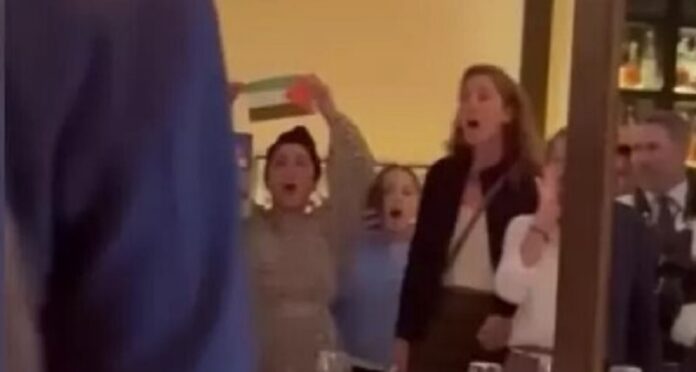 قطع ناشطون الثلاثاء عشاء الرئيس الأميركي دونالد ترامب، وعدد من وزرائه في أحد المطاعم بالعاصمة واشنطن، وهم يرددون هتافات تطالب بحرية الفلسطينيين، واصفين إياه بـ”هتلر عصرنا”.