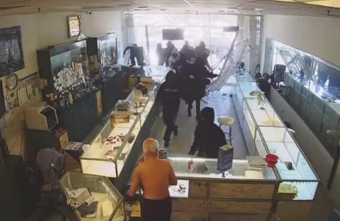 التقطت كاميرات المراقبة لقطات مروعة لعصابة مقنعة وهي تقتحم متجر “كيم هونغ” للمجوهرات في “سان خوسيه” بكاليفورنيا في الولايات المتحدة الأمريكية.