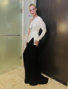 إيميلي بلنت ارتدت سروالاً أسود مقلّماً مع “توب” مكشوفة وبتفصيل الدانتيل من (Stella McCartney)، وتزيّنت بمجوهرات (Messika). كيرستن دانست تألّقت بفستان طويل بكتف واحدة من الدانتيل الشفاف من (Julie de Libran Couture).