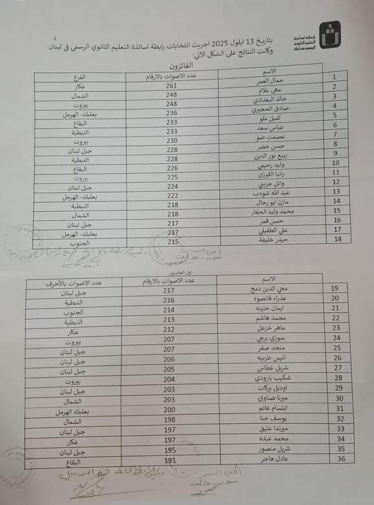 تمكّنت لائحة “الأستاذ الثانوي المستقل”، من خرق “لائحة العمل النقابي” التي تشكّل ائتلافاً بين الأحزاب، بأربعة مقاعد من أصل 18، في انتخابات الهيئة الإدارية لرابطة أساتذة التعليم الثانوي الرسمي. ونجح من “الأستاذ الثانوي المستقل”: صادق الحجيري بـ236 صوتاً، مازن أبو رحال (218 صوتاً)، علي الطفيلي (217 صوتاً)، وحسن قمر (217 صوتاً)، فيما استحوذت الأحزاب المكونة على المقاعد الـ14.