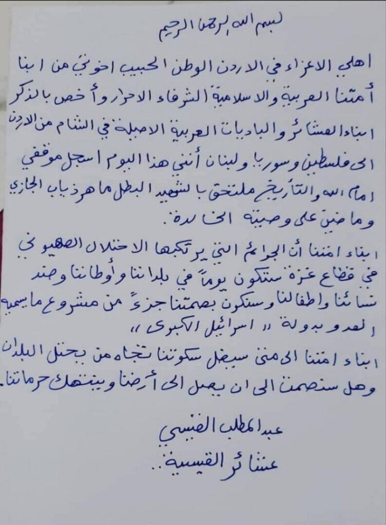 وخاطب القيسي أبناء الأردن و”إخوته” الشرفاء الأحرار من أبناء العالمين العربي والإسلامي وخص بالذكر أبناء العشائر والبوادي في الشام من الأردن إلى فلسطين وسوريا ولبنان “إنني في هذا اليوم أسجل موقفي أمام الله والتاريخ، ملتحقاً بركب الشهيد البطل ماهر ذياب الجرابعة وما مضى على وصيته إلا بضعة أيام”.