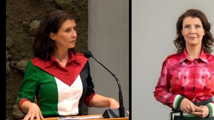 غادرت النائبة الهولندية إستير أوويهاند، زعيمة حزب من أجل الحيوانات (PvdD)، قاعة مجلس النواب بعد أن طُلب منها ذلك، إثر ظهورها مرتدية قميصا يمثل العلم الفلسطيني.