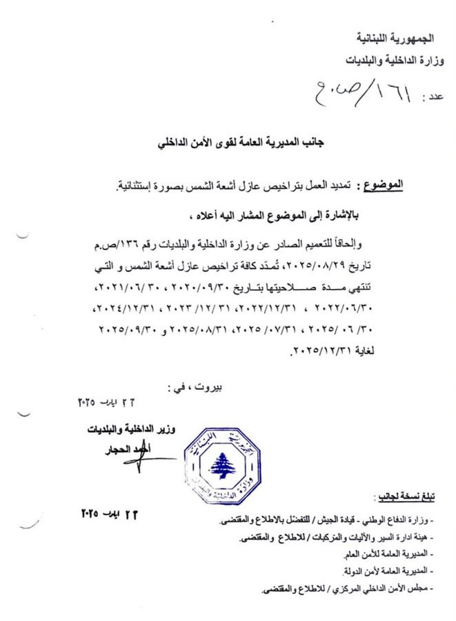 الرئيسيةأمن و قضاءتمديد العمل بتراخيص عازل أشعة الشمس لغاية 31/12/2025أمن و قضاءشريط الاحداثتمديد العمل بتراخيص عازل أشعة الشمس لغاية 31/12/2025 تصوير عباس سلمانأصدر وزير الداخلية والبلديات أحمد الحجار قرارا قضى بتمديد العمل بتراخيص عازل أشعة الشمس بصورة إستثنائية لغاية 31/12/2025.Tagsأحمد الحجارعازل أشعة الشمسشريط الأحداثالكويت: مسيرتان آتيتان من العراق استهدفتا مركزين حدوديين 24/04/2026 “روابط القطاع العام” يعلن الاضراب التحذيري الاثنين 24/04/2026 جريح في انقلاب شاحنة على أوتوستراد نهر إبراهيم 24/04/2026 “إدارة السير”: بدء استقبال طلبات المواطنين الراغبين بالحصول على اللاصقة الإلكترونية 24/04/2026