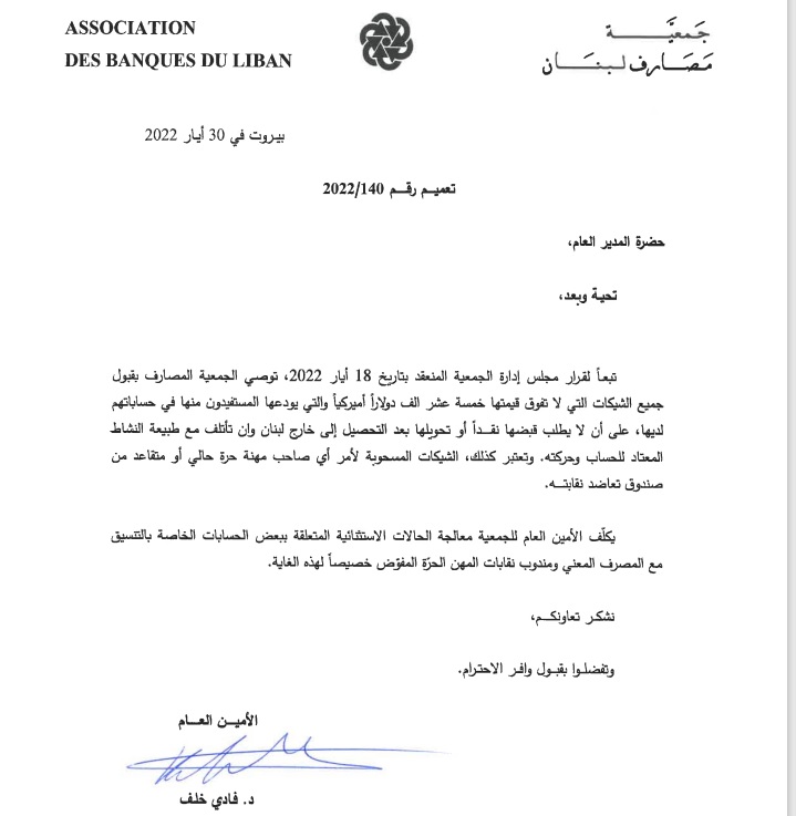 توصي جمعية المصارف بقبول جميع الشيكات التي لا تفوق قيمتها خمسة عشر الف دولاراً أميركيا والتي يودعها المستفيدون منها في حساباتهم لديها، على أن لا يطلب قبضها نقـدأ أو تحويلها بعد التحصيل إلى خارج لبنان وان تأتلف، طبيعة النشاط المعتاد للحساب وحركته. وتعتبر كذلك، الشيكات المسحوبة لأمر أي صاحب مهنة حرة حالي أو متقاعد من صندوق تعاضد نقابته، بحسب تعميم الجمعية .