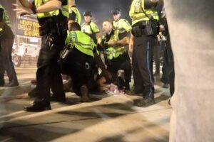 وتبيّن لقطات المتظاهرين وعناصر الشرطة وهم يدفعون بعضهم البعض ويتصارعون حتى على الأرض.