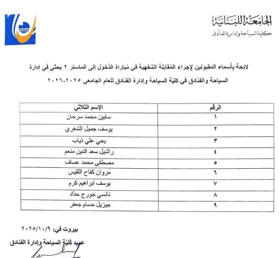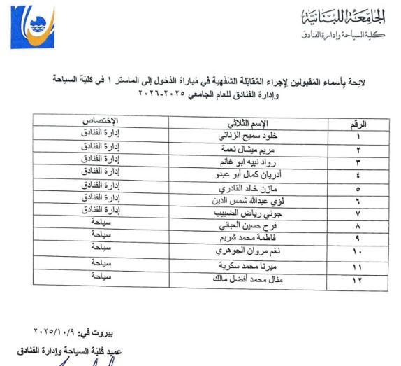 الرئيسيةمنوعاتشبابالطلاب المدعوون لمقابلة شفهية للدخول إلى ماستر كلية السياحةشبابشريط الاحداثالطلاب المدعوون لمقابلة شفهية للدخول إلى ماستر كلية السياحة نشرت الجامعة اللبنانية أسماء الطلاب المدعوين لإجراء مقابلة شفهية للدخول إلى الماستر في كلية السياحة وإدارة الفنادق، للعام الجامعي 2025 – 2026.الماستر 1الماستر 2 بحثيTagsالجامعة اللبنانيةطلابكلية السياحةماسترمقابلة شفهيةشريط الأحداثتدابير سير السبت 05/12/2025 607 قتيلاً بإعصار سريلانكا (فيديو) 05/12/2025 رجّي لمجلس الأمن: الدبلوماسية خيارنا 05/12/2025 80 قتيلاً في السودان.. والأمم المتحدة تحذر من كارثة إنسانية 05/12/2025 مقالات ذات صلة أمن و قضاءتدابير سير السبت 05/12/2025 شريط الاحداث607 قتيلاً بإعصار سريلانكا (فيديو) 05/12/2025 سياسةرجّي لمجلس الأمن: الدبلوماسية خيارنا 05/12/2025