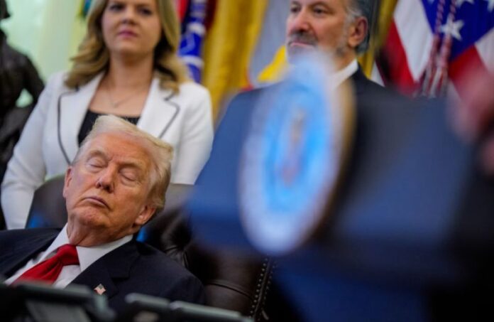 أثارت صور متداولة على مواقع التواصل الاجتماعي للرئيس الأميركي دونالد ترامب نائما خلال مؤتمر صحافي في المكتب البيضاوي موجة من الجدل والانتقادات من معارضيه.
