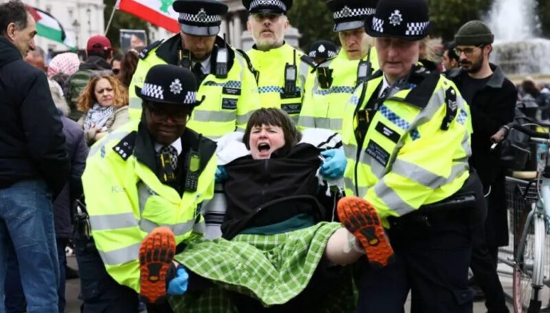 اعتقلت شرطة لندن عشرات المتظاهرين بعد أن رفعوا لافتات أمام وزارة العدل البريطانية، تضامناً مع ستة نشطاء فلسطينيين يقتربون من أسبوعهم الرابع في الإضراب عن الطعام، بعد احتجازهم لعدة أشهر دون محاكمة.