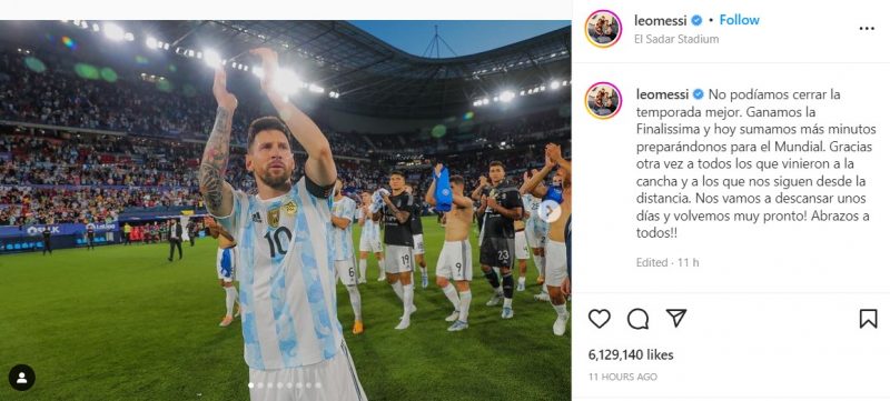 وأعرب ميسي عن سعادته، عبر حسابه على “إنستغرام”: “لا يمكننا إنهاء الموسم بشكل أفضل، لقد فزنا بفيناليسيما (أمام إيطاليا)، واليوم أضفنا المزيد من الدقائق للتحضير لكأس العالم”.