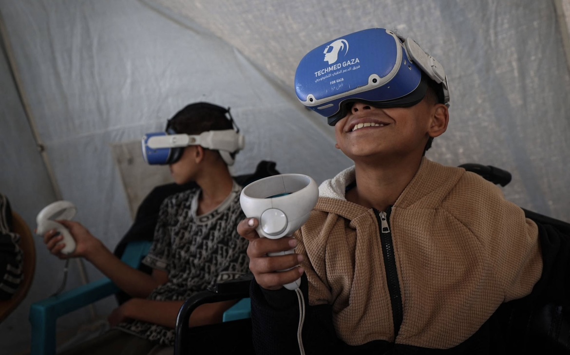 داخل خيمة بيضاء نُصبت على أرضية رملية في الزوايدة وسط غزة، تتصاعد أصوات بحماس ويتجول أطفال في عالم افتراضي، بفضل خوَذ يضعونها على رؤوسهم، في إطار برنامج علاجي يهدف إلى أخذهم بعيداً عن أهوال الحرب المدمّرة في القطاع الفلسطيني.