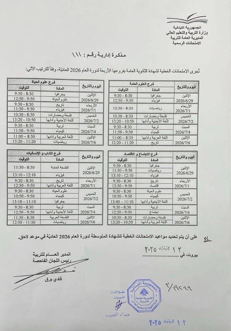 حددت وزارة التربية والتعليم العالي مواعيد وبرنامج الاتحانات الرسمية لشهادة الثانوية العامة بفروعها الأربعة لدورة 2026، على أن يتم تحديد مواعيد امتحانات الشهادة المتوسطة ـ البريفيه، لدورة 2026 في موعد لاحق.