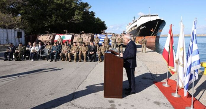 أعلنت قيادة الجيش، أنه بتاريخ 15 /1 /2026، أقيم في مرفأ بيروت حفل تسلّم هبة مقدمة من قبل السلطات اليونانية للجيش، بحضور وزير الدفاع الوطني اللواء ميشال منسّى، والسفيرة اليونانية في لبنان Despina A. Koukoulopoulou، ونائب رئيس الأركان للتجهيز على رأس وفد من قيادة الجيش، إلى جانب عدد من الضباط. وتضمنت الهبة 13 ناقلة جند من نوع (M113) و10 آليات مع قطع البدل العائدة لها.