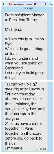 كما تضمن الاقتراح، الذي قدمه ماكرون إلى ترامب في رسالة على “واتس آب”، إمكانية دعوة أوكرانيا للمشاركة، إلى جانب الدنمارك وسوريا، من أجل مناقشة الخلافات المرتبطة بملف غرينلاند، إضافة إلى بحث الوضع في سوريا.