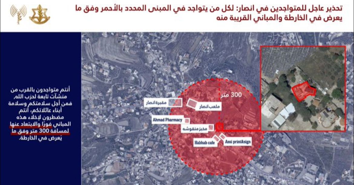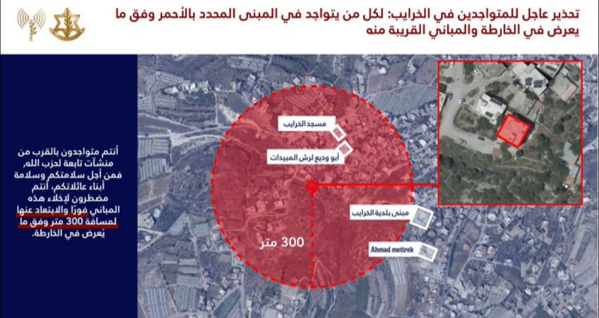 وجه المتحدث باسم جيش الاحتلال الاسرائيلي إنذاراً عاجلاً إلى سكان بلدة الخرايب وأنصار، في جنوب لبنان، وخاصة في المباني المحددة بالأحمر، وفق ما يُعرض في الخريطة المرفقة والمباني المجاورة له.