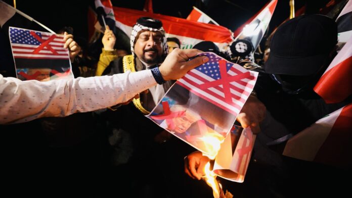 وأفاد مصوّر وكالة “فرانس برس”، أن متظاهرين أحرقوا العلم الأميركي وصورًا لترامب، ورددوا شعارات من بينها “كلا أميركا” و”نعم العراق” و”نعم المالكي”، فيما رفعوا العلم العراقي خلال التظاهرة.