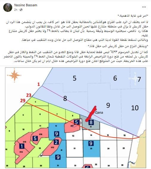 اعتبر الرئيس السابق لوفد ترسيم الحدود البحرية، العميد بسام ياسين، أن “الرد على اقتراح هوكشتاين بالمطالبة بحقل قانا، أمر غير كاف”. معتبراً أن الرد يجب أن يتضمن “أنّ حقل كاريش لا يزال في منطقة متنازع عليها، لحين التوصل إلى حل عادل وفقاً للقانون الدولي”.