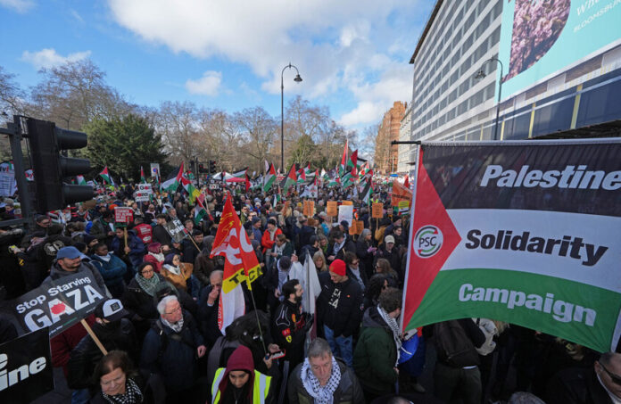 شهدت العاصمة البريطانية لندن، تظاهرة حاشدة شارك فيها عشرات الآلاف من المتضامنين مع الشعب الفلسطيني، تحت شعار “المسيرة الوطنية من أجل فلسطين”.