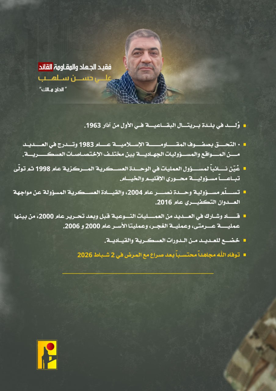 نعى “حزب الله القيادي الحاج علي حسن سلهب “الحاج مالك”‏، الذي توفي بعد صراع مع المرض.