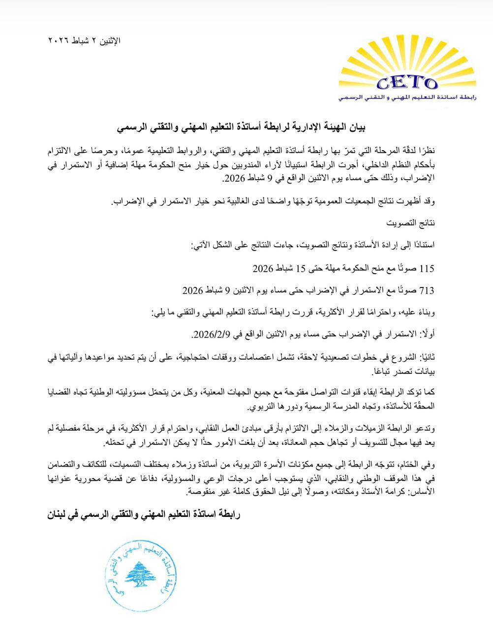 الرئيسيةشريط الاحداث"التعليم المهني": مستمرون بالإضرابشريط الاحداثمحليات“التعليم المهني”: مستمرون بالإضراب أعلنت رابطة التعليم المهني الاستمرار في الإضراب، حتى مساء الإثنين المقبل. Tagsاضرابالتعليم المهنيرواتبمعاهدشريط الأحداثجريحان بحادث سير في نهر إبراهيم (صورة) 02/02/2026 الحريري إلى لبنان في 14 شباط 02/02/2026 مناورة بحرية مشتركة بين “إسرائيل” وأميركا! 02/02/2026 “مشاة البحرية” الأميركية تستقبل قادة من الجيش اللبناني 02/02/2026 مقالات ذات صلة أمن و قضاءجريحان بحادث سير في نهر إبراهيم (صورة) 02/02/2026 سياسةالحريري إلى لبنان في 14 شباط 02/02/2026 شريط الاحداثمناورة بحرية مشتركة بين “إسرائيل” وأميركا! 02/02/2026
