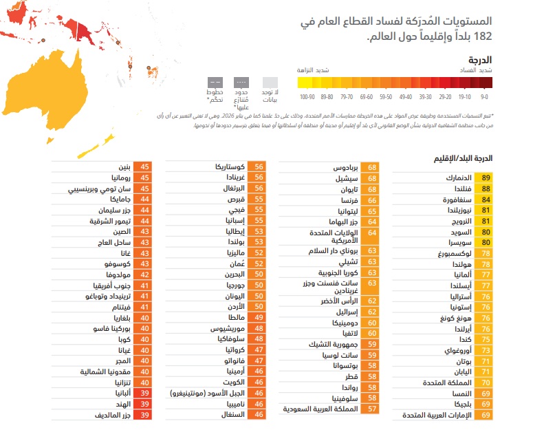 يقيس مؤشر مدركات الفساد لعام 2025 مستويات الفساد المدركة في القطاع العام في 182 بلداً وإقليماً استناداً إلى 13 مصدراً مستقلًا للبيانات وباستخدام مقياس يتراوح من 0 (شديد الفساد) إلى 100 (شديد النزاهة). وقد انخفض المتوسط العالمي لمؤشر مدركات الفساد هذا العام لأول مرة منذ أكثر من عقد ليصل إلى 42 من أصل 100 درجة.