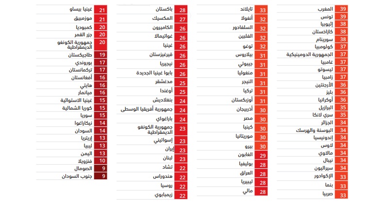 أما لبنان فقد حصل على درجة 23 وحل في المرتبة 153 عالمياً.
