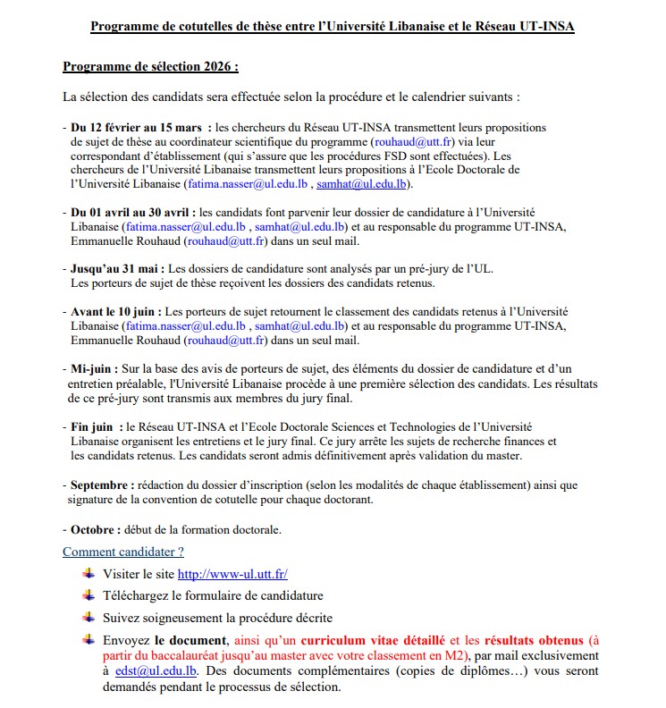 أعلن المعهد العالي للدكتوراه في العلوم والتكنولوجيا – الجامعة اللبنانية، بالتعاون مع شبكة UT-INSA، فتح باب تقديم مقترحات أطروحات الدكتوراه لبرنامج الدكتوراه المشترك للعام الجامعي 2026 – 2027.