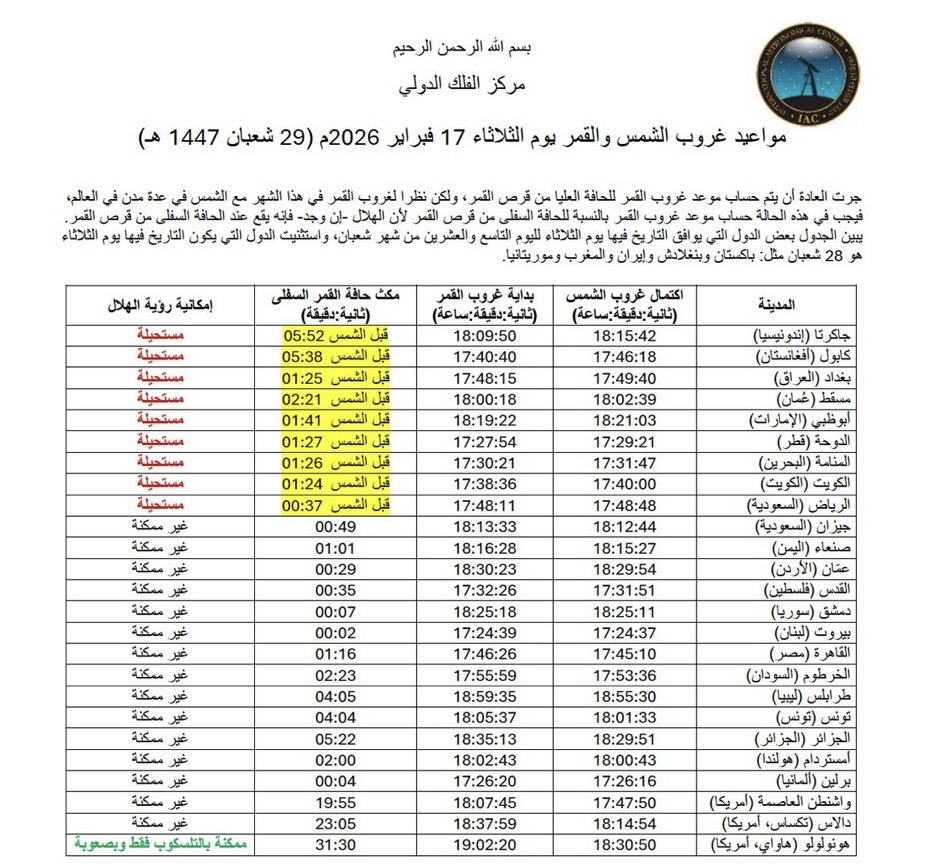 ولفت المركز إلى أن الجداول المنشورة تخص الدول التي يوافق فيها الثلاثاء 29 شعبان، مستثنياً الدول التي لا يزال فيها التاريخ 28 شعبان، مثل باكستان وبنغلادش وإيران والمغرب وموريتانيا، نظراً لاختلاف اعتماد الدول بين الحسابات الفلكية والرؤية الشرعية في تحديد بدايات الأشهر الهجرية.