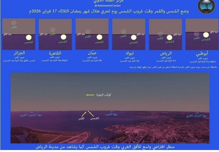 وأوضح المركز، في منشور توضيحي عبر منصة “إكس” مرفقاً بجداول وصور تفصيلية، أن الحسابات الفلكية الدقيقة تشير إلى عدم إمكانية رؤية الهلال في عدد كبير من الدول والمدن حول العالم، بما فيها عواصم في الشرق الأوسط وآسيا وأفريقيا وأوروبا وأميركا.