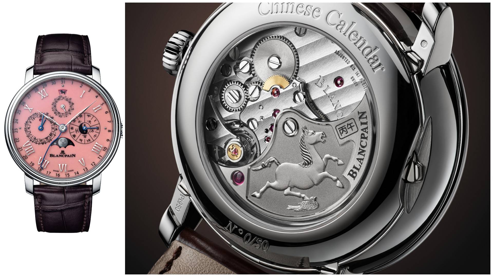 • “بلانبان”: ساعة “Traditionnel Chinois Calendrier Villeret” بإصدار محدود من 50 قطعة، مزودة بحركة معقدة عيار 3638، وتعرض الحصان السماوي “تيانما” على دوار من الذهب عيار 22.