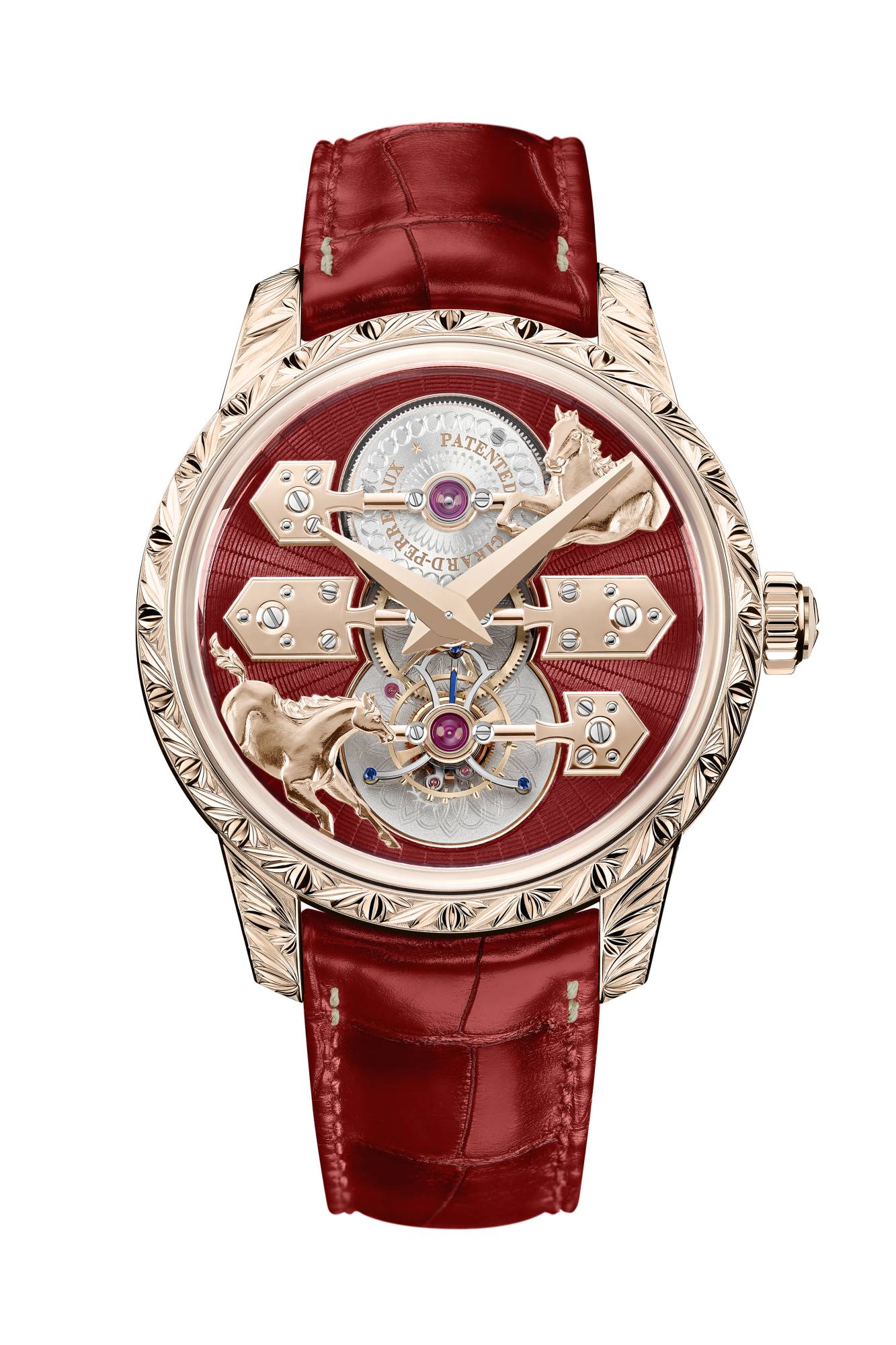 • “فاشرون كونستانتين”: ساعة من الذهب الوردي مزينة بنقش حصان يدوي على الميناء الزجاجي.