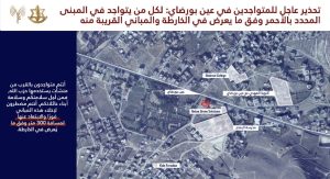 وحذّر سكان المباني المحددة بالأحمر في الخرائط المرفقة والمباني المجاورة لها من البقاء في هذه المواقع، مؤكداً أن الإخلاء الفوري والابتعاد عنها لمسافة لا تقل عن 300 متر ضروري لضمان سلامتهم.