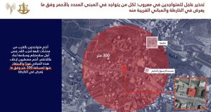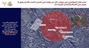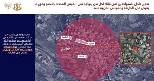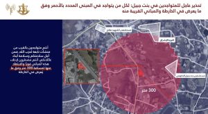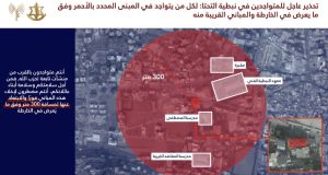 ودعا السكان القاطنين في المباني المحددة باللون الأحمر في الخرائط المرفقة، إضافة إلى الأبنية المجاورة لها، إلى إخلائها فوراً والابتعاد عنها لمسافة لا تقل عن 300 متر، محذّراً من أنّ البقاء في محيط هذه المباني يعرّضهم للخطر.