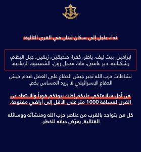 وجاء في البيان:” أنشطة حزب الله تجبر جيش الدفاع على العمل ضده بقوة ولا ننوي المساس بكم، من أجل سلامتكم عليكم إخلاء بيوتكم فوراً والابتعاد خارج القرى والبلدات لمسافة لا تقل عن 1,000 متر إلى أراضي مفتوحة، كل من يتواجد بالقرب من عناصر حزب الله ومنشآته ووسائله القتالية يعرّض حياته للخطر، حافظوا على سلامتكم وسلامة أحبائكم واخلوا فورًا”.