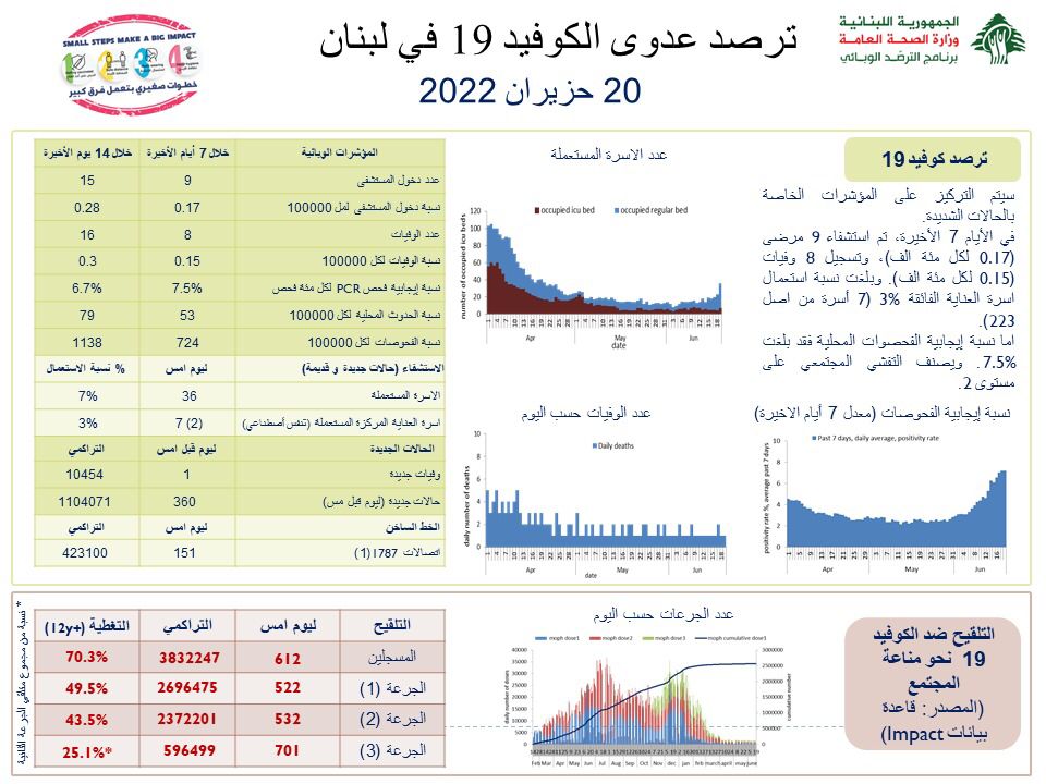 الرئيسيةشريط الاحداث360 إصابة جديدة بكورونا اليومشريط الاحداثمحليات360 إصابة جديدة بكورونا اليوم أعلنت وزارة الصحة العامة في تقريرها اليومي تسجيل “360 إصابة جديدة بفيروس كورونا رفعت العدد التراكمي للحالات المثبتة الى 1104071، كما تم تسجيل حالة وفاة واحدة”. Tagsكوروناوزارة الصحة العامةشريط الأحداثدوري أبطال أوروبا لكرة القدم: ريال مدريد يكتسح موناكو وأرسنال يهزم الإنتر 20/01/2026 غارات إسرائيلية تتحدى السيادة.. والطبقة السياسية تكافح لحماية الدولة! 20/01/2026 ترامب: الشرع رجل قوي.. وشعب غرينلاند سيكون سعيداً! 20/01/2026 من بوابة المادة 82.. المغرب يجهز “سلاحا قانونيا وتتويج السنغال بالتاج الأفريقي مُهدد 20/01/2026 مقالات ذات صلة Sliderدوري أبطال أوروبا لكرة القدم: ريال مدريد يكتسح موناكو وأرسنال يهزم الإنتر 20/01/2026 سياسةغارات إسرائيلية تتحدى السيادة.. والطبقة السياسية تكافح لحماية الدولة! 20/01/2026 شريط الاحداثترامب: الشرع رجل قوي.. وشعب غرينلاند سيكون سعيداً! 20/01/2026