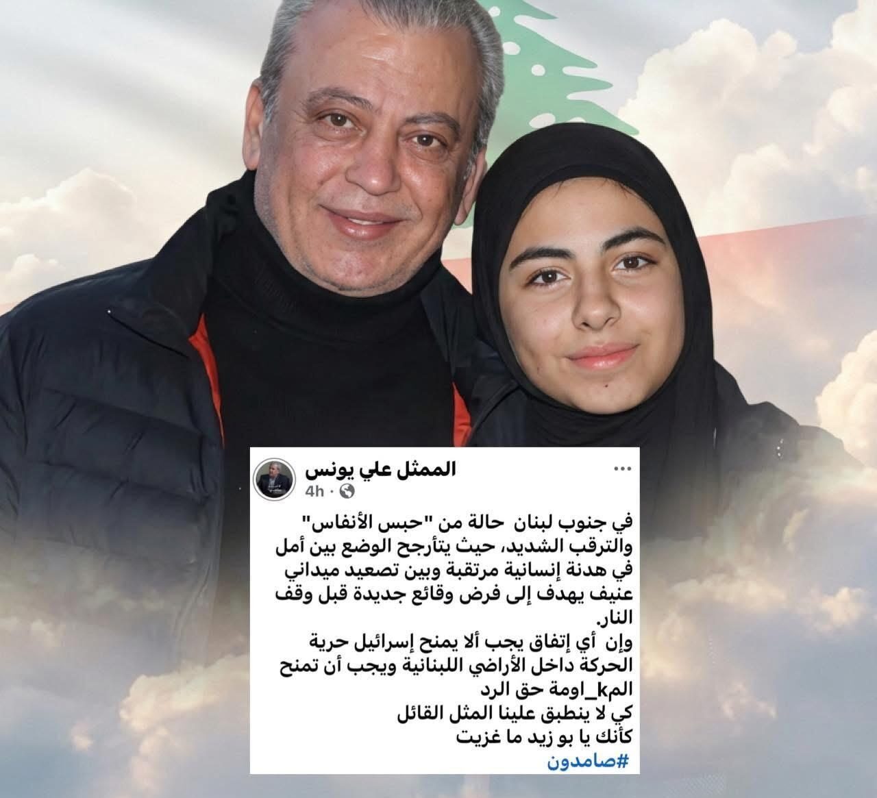 قبل 4 ساعات من بدء سريان وقف اطلاق النار في لبنان، ارتقى الممثل علي يونس وابنته باعتداء اسرائيلي، بعد أن دون كلماته الاخيرة على مواقع التواصل الاجتماعي.