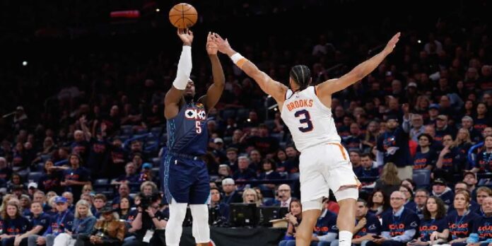 عزز حامل لقب دوري الرابطة الوطنية لكرة السلة الاميركية نادي اوكلاهوما سيتي ثاندر فرصه للتقدم الى نصف نهائي المجموعة الغربية من بطولة الموسم الحالي، بعد ان تمكن من الفوز على فينيكس صنز في المباراة الثانية من الدور الاول في النهائيات، بفارق 13 نقطة 120–107 على ارض ملعب بايكوم سنتر في اوكلاهوما سيتي.