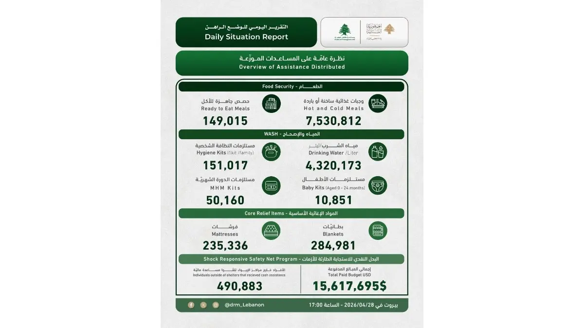 الرئيسيةأمن و قضاء116154 نازحاً في مراكز الإيواءأمن و قضاءشريط الاحداث116154 نازحاً في مراكز الإيواء تصوير عباس سلمانأعلنت “وحدة إدارة مخاطر الكوارث” في السرايا الكبيرة في تقريرها اليومي، أن “العدد الإجمالي للنازحين في مراكز الإيواء بلغ 116154 والعدد الإجمالي للعائلات النازحة في مراكز الإيواء 30526، في حين ارتفعت حصيلة الشهداء إلى 2521 والجرحى إلى 7804”. Tagsحرب لبنانعائلاتمراكز ايواءنزوحشريط الأحداثكاتس: وجهنا تعليمات لتدمير البنى التحتية بـ”المنطقة الأمنية” في جنوب لبنان 28/04/2026 استهداف تجمعات لجيش العدو في الطيبة 28/04/2026 الحاج حسن يعلّق على تصريحات أميركا: أليس كل هذا تدخلاً في السيادة يا سياديون؟ 28/04/2026 غارات على كفردونين وسلعا.. واستهداف سيارة في الحنية 28/04/2026