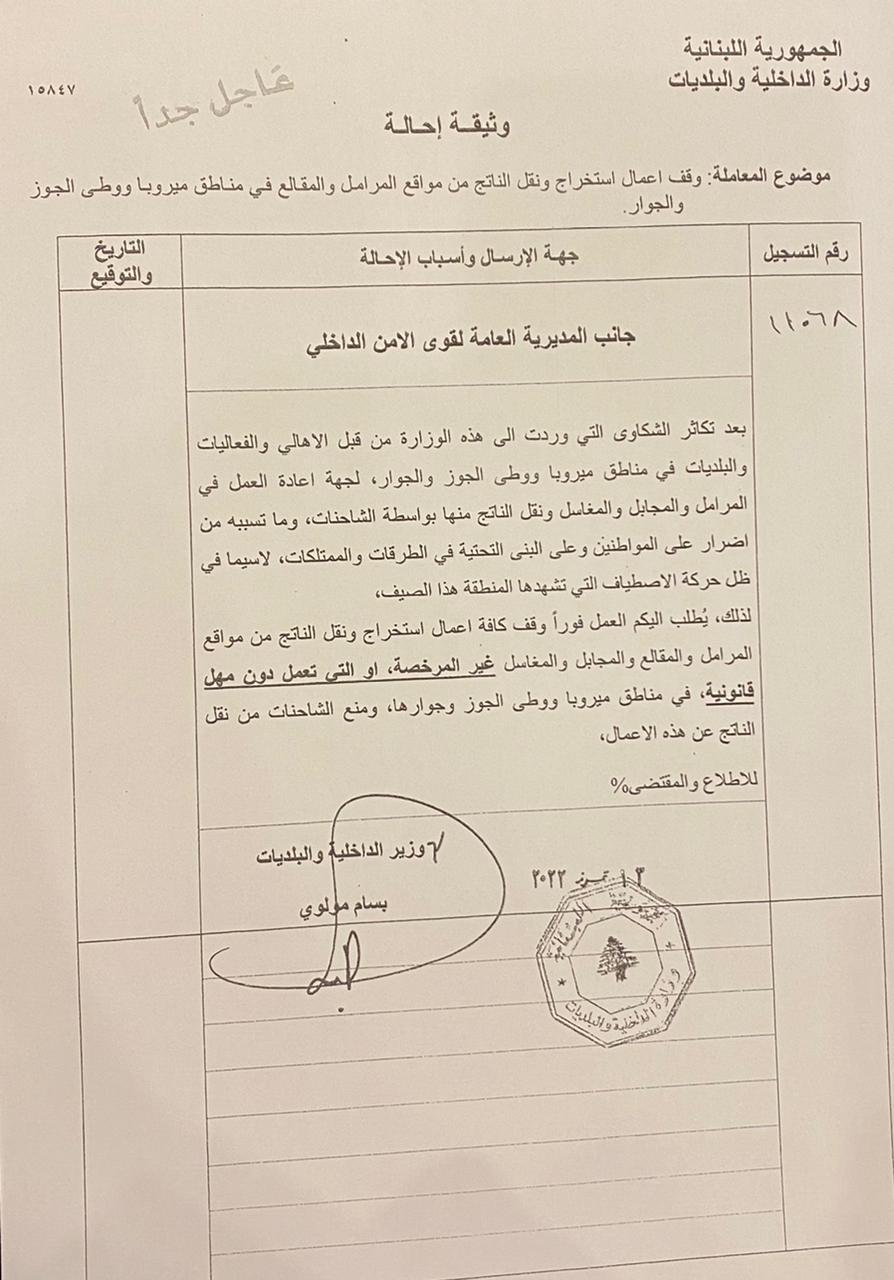 طلب وزير الداخلية والبلديات في حكومة تصريف الأعمال بسام مولوي من المديرية العامة لقوى الأمن الداخلي بوقف أعمال استخراج ونقل الناتج من مواقع المرامل والمقالع والمجابل والمغاسل غير المرخصة، او التي تعمل دون مهل قانونية في مناطق ميروبا ووطى الجوز والجوار.