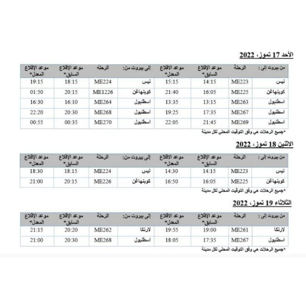 أعلنت شركة “طيران الشرق الأوسط”ـ الخطوط الجوية اللبنانية، عن تعديل جزء من جدول رحلاتها للأيام التالية: 17 و18 و19 تموز 2022 وذلك لأسباب تشغيلية خارجة عن إرادتها.
