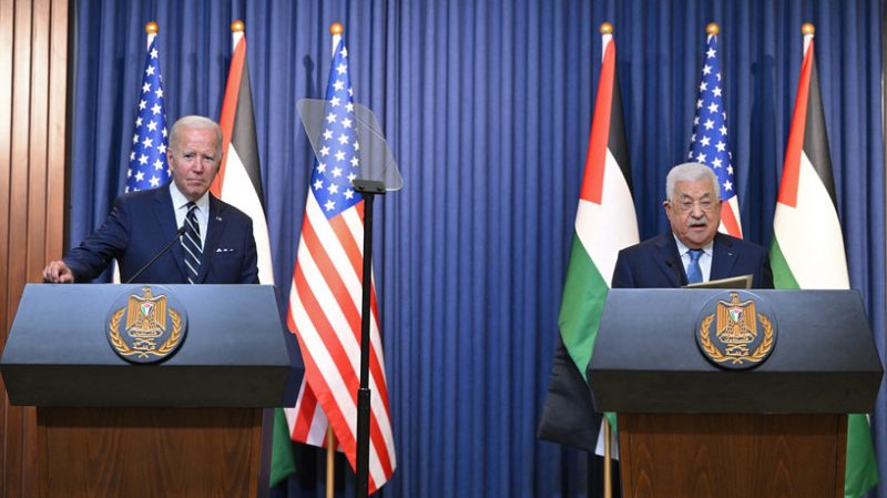 وأشار بايدن في مؤتمر صحفي مشترك، مع الرئيس الفلسطيني محمود عباس في بيت لحم، الى أن “الشعب الفلسطيني يستحق العيش في دولة مستقلة وذات سيادة، وهناك حاجة لحل الدولتين لشعبين لديهم صلة في هذه الأرض وهناك حاجة لدولتين تحترمان الشعبين للعيش بكرامة، ولا يجب أن يكون هناك منع للتنقل أو أن يتعرض الأطفال لأي خطر”.