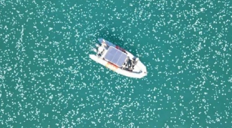 وبدت القناديل في الصور الملتقطة من كاميرا طائرة مسيرة، على هيئة بقع بيضاء تطفو على سطح مياه البحر.