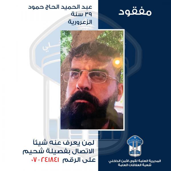 تعمم المديرية العامة لقوى الأمن الداخلي بناء على إشارة القضاء المختص، صورة المفقود: عبد الحميد الحاج حمود (مواليد عام 1983، سوري الجنسية)، الذي غادر منزله الكائن في بلدة الزعرورية بتاريخ 24/7/2022 ولم يعد لغاية تاريخه، بحسب بيان قوى الأمن.