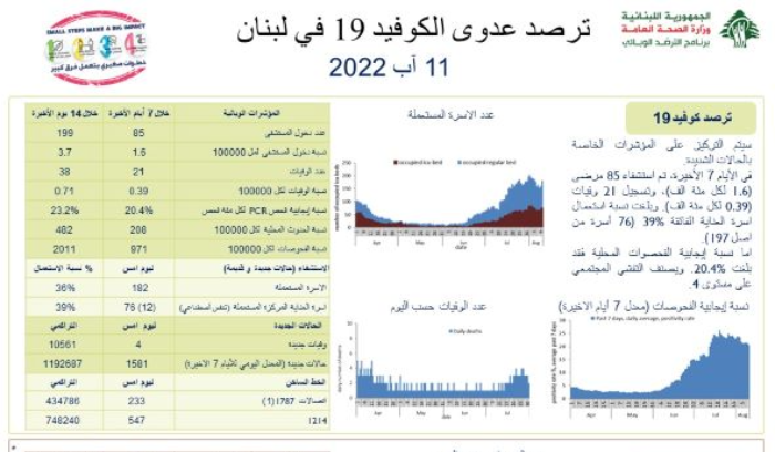 أعلنت وزارة الصحة العامة في تقريرها اليومي، تسجيل “1581 إصابة جديدة بفيروس كورونا، رفعت العدد التراكمي للحالات المثبتة الى 1192687، كما تم تسجيل 4 وفيات”.