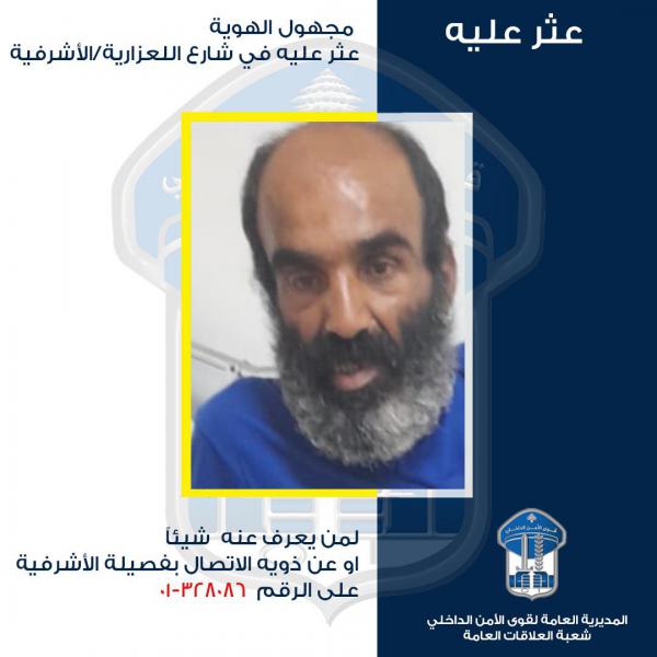 عممت المديّرية العامّة لقوى الأمن الدّاخلي صورة رجل مجهول الهويّة عثر عليه في الأشرفيّة.